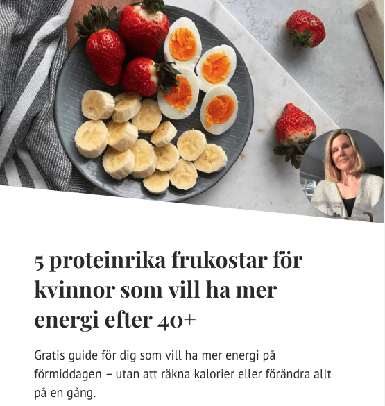 Vill du ha fler enkla tips om mat som faktiskt fungerar i vardagen? Prenumerera på mitt nyhetsbrev – jag skickar ut praktiska råd varannan vecka, utan krångel och utan krav. Du får en gratis-guide av mig med 5 recept på proteinrika frukostar för kvinnor 40+.
